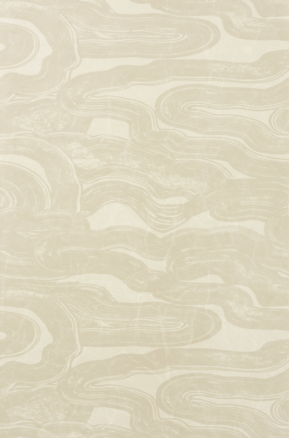 Curves and brush strokes reveal a contemporary reverie. It is printed on embossed vinyl with the look of paper and has an iridescent finish.