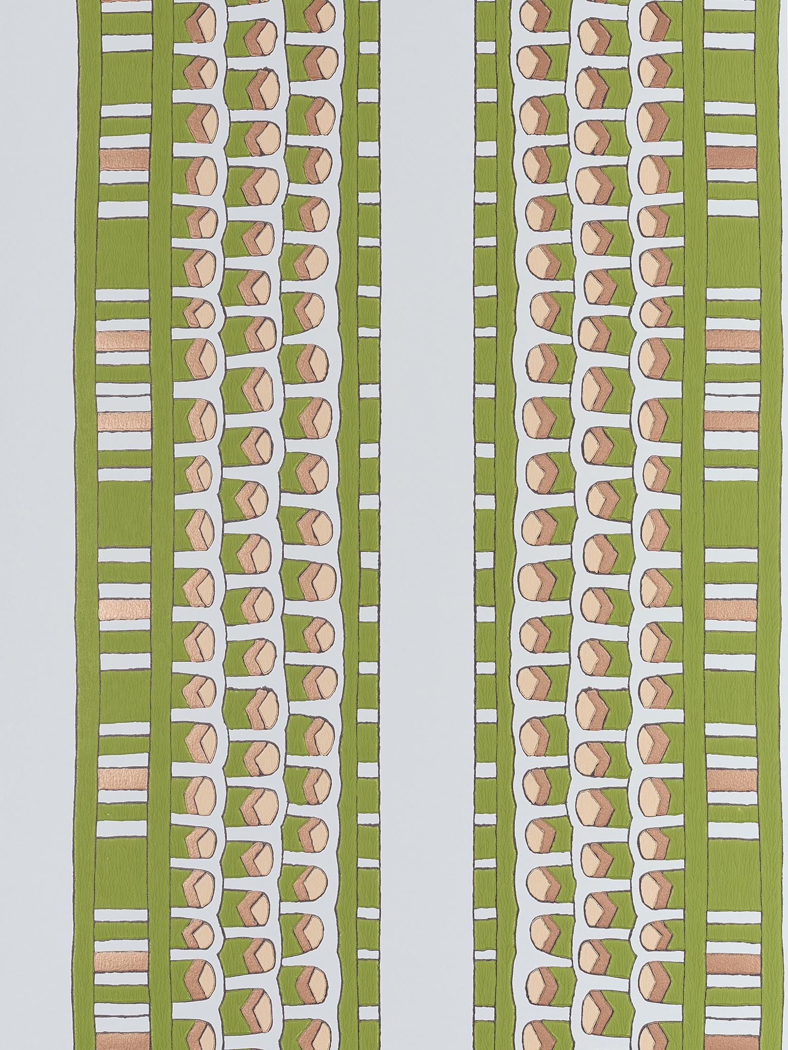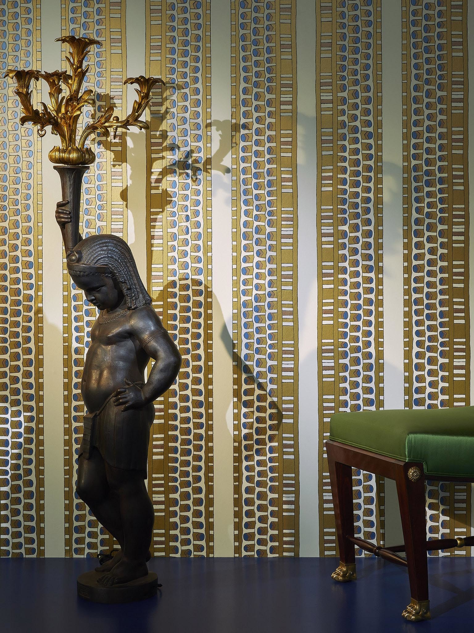 This stripe, inspired by the lid of an Egyptian coffin in the Louvre's Department of Egyptian Antiquities, freely evokes the fabulous finery of the pharaohs. The traditional print with metallic reflections elegantly highlights the details of the wallpaper.