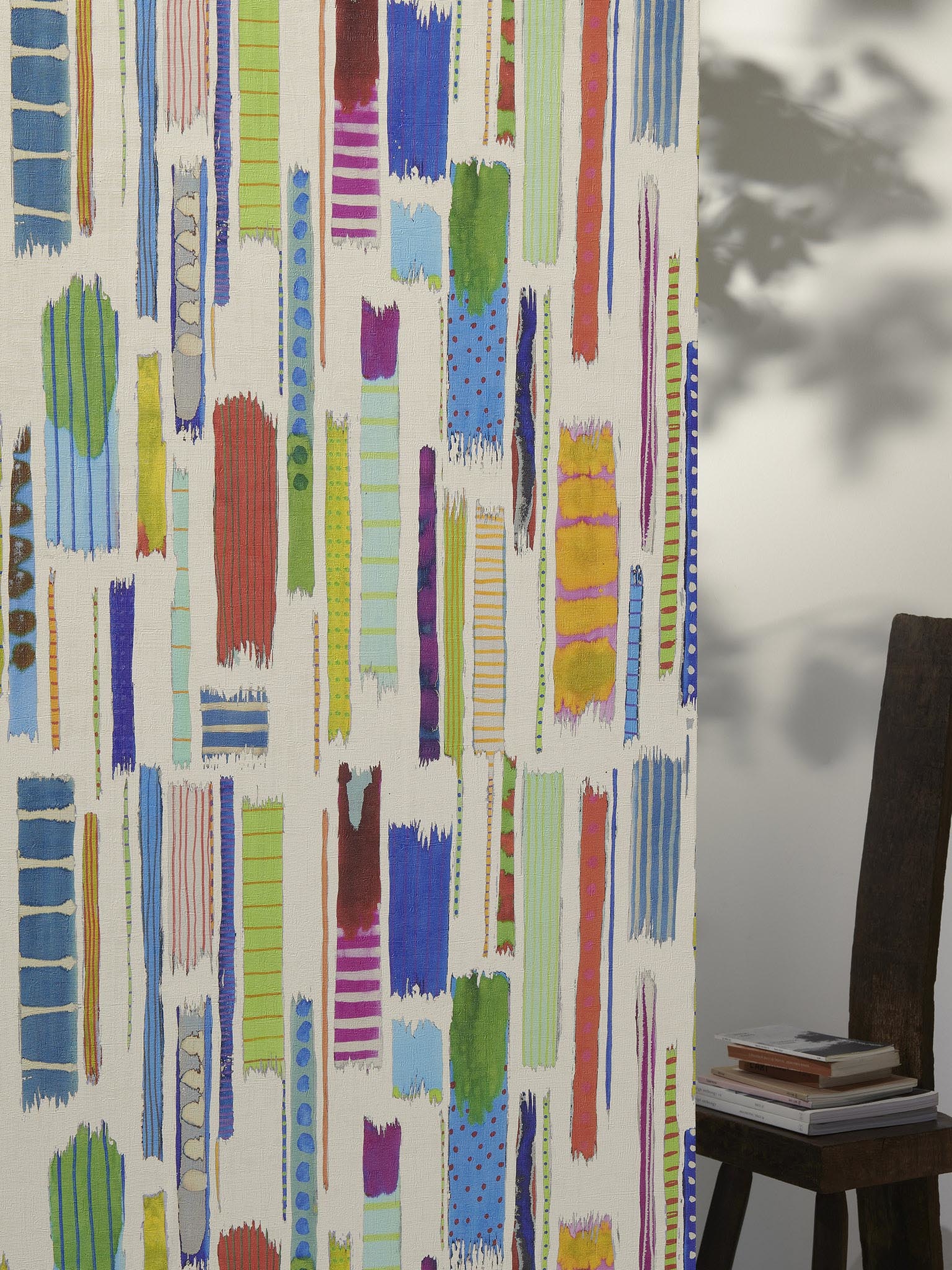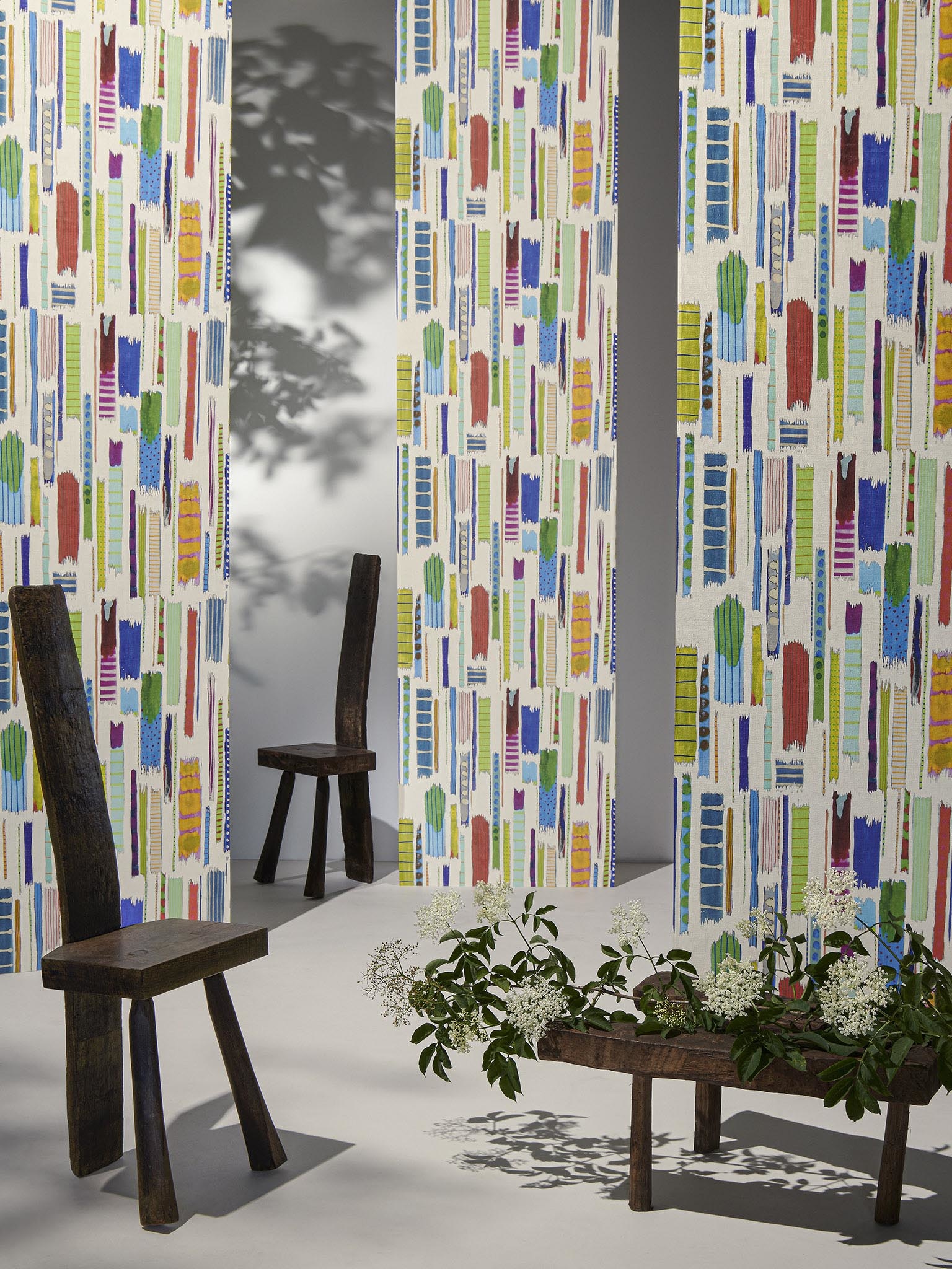 Porte-Bonheur is a wallpaper that is inspired by a gri-gri: a lucky charm from Africa. This wallcovering by Pierre Frey from the Les Dessins 6 collection has a rhythmic pattern full of different shapes. A graphic wallpaper that is perfect for a colourful, indigenous and cheerful interior.