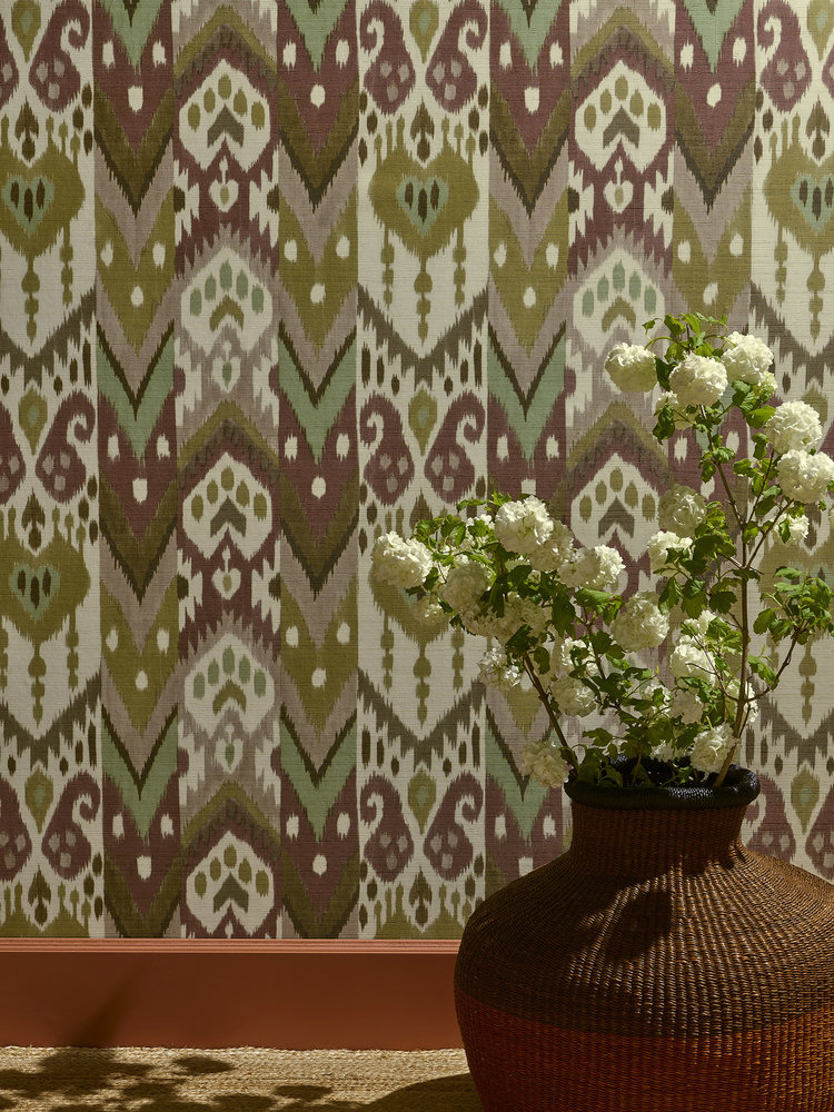 Praslin wallpaper features a graphic and colorful ikat drawing reminiscent of Central Asia's distant horizons. Printed on silk like-effect vinyl.