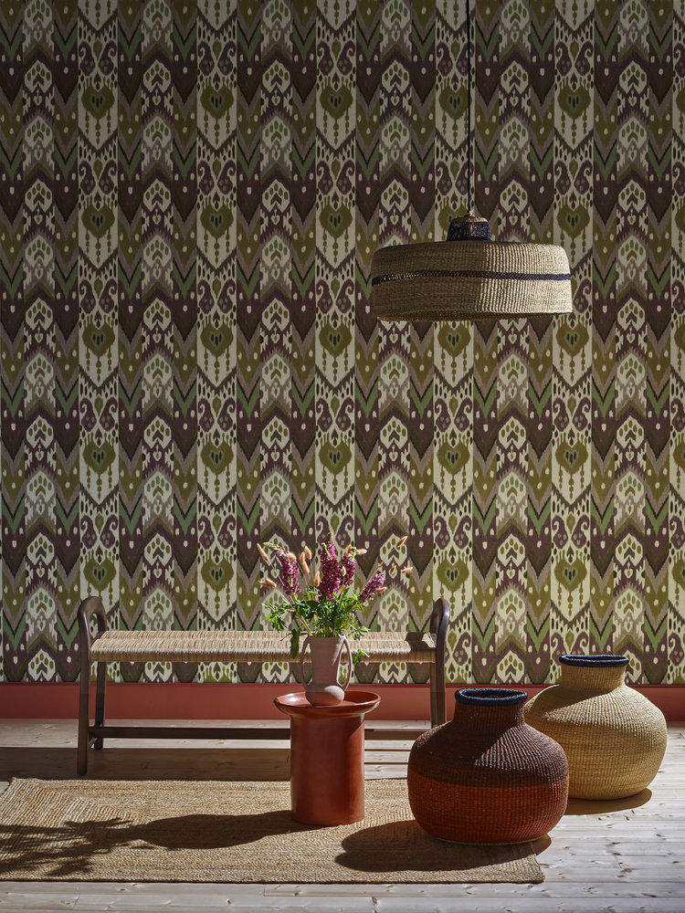 Praslin wallpaper features a graphic and colorful ikat drawing reminiscent of Central Asia's distant horizons. Printed on silk like-effect vinyl.