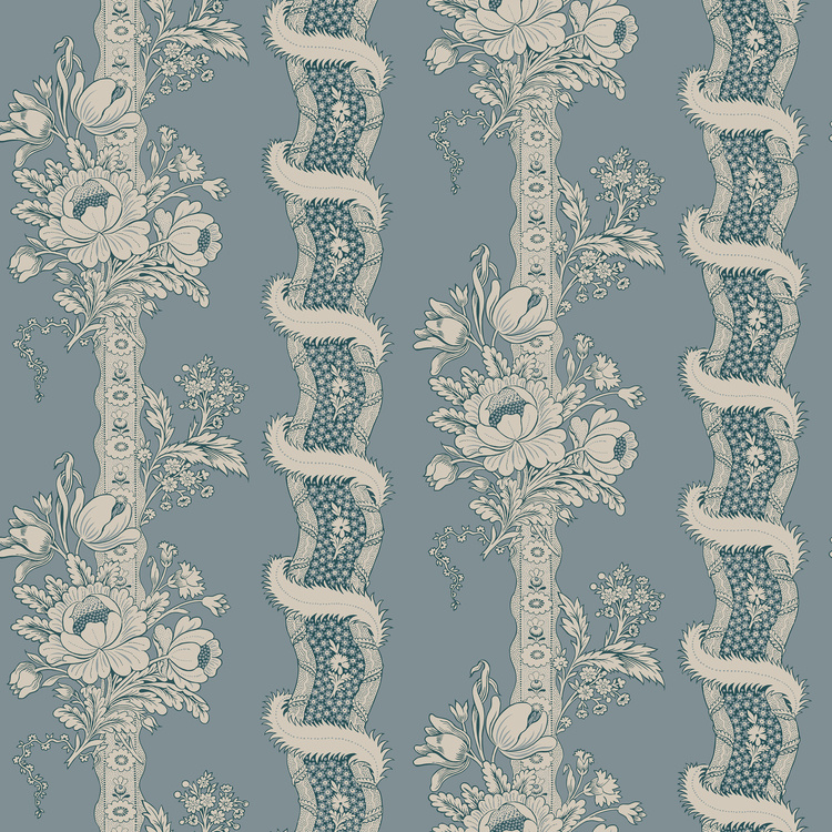 Alexandra is a wallpaper inspired by hand-painted Dominoes from France, dating back to the early 19th century. This wallcovering from Sandberg, from the Le Village collection, features vertically flourishing stripes and upward swirling ribbons that create a sense of height in any space. A feminine wallpaper that is perfect for a charming, classic and romantic interior.