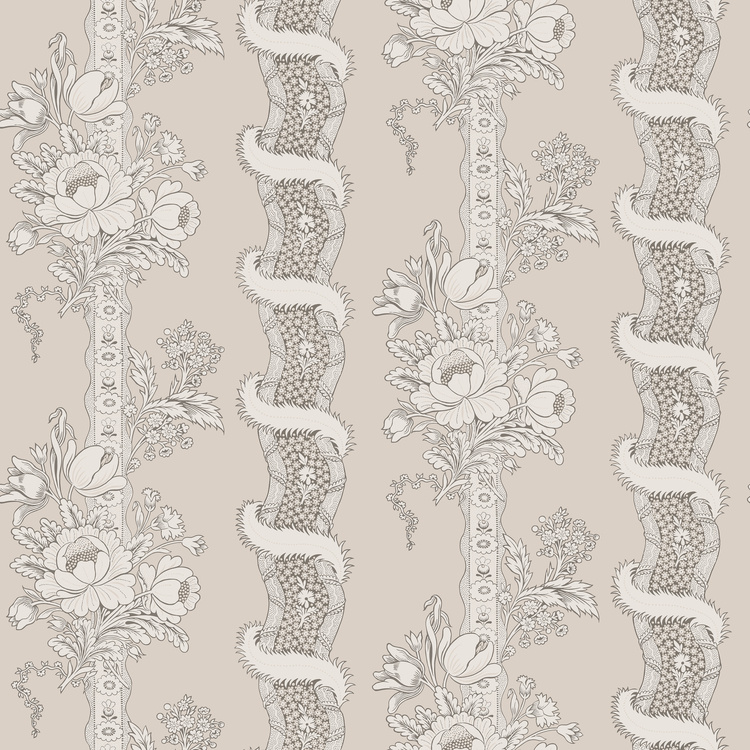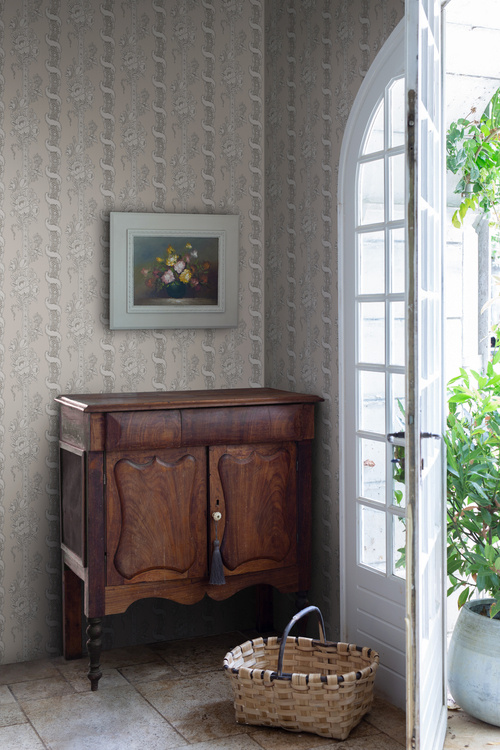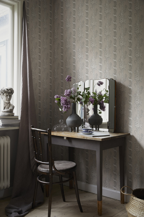 Alexandra is a wallpaper inspired by hand-painted Dominoes from France, dating back to the early 19th century. This wallcovering from Sandberg, from the Le Village collection, features vertically flourishing stripes and upward swirling ribbons that create a sense of height in any space. A feminine wallpaper that is perfect for a charming, classic and romantic interior.