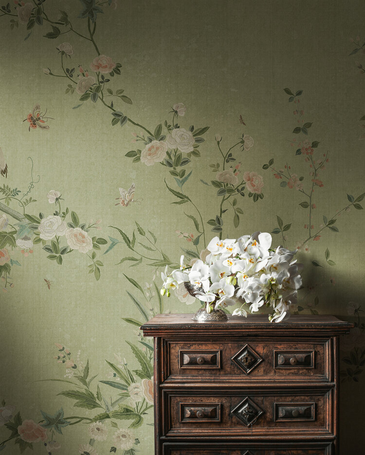 This collection by Sandberg is inspired by a fabric. An embroidered silk Chinoiserie, more than 100 years old, from Canton, China, that once made the long journey to France. The Chinoiserie brings the magic of the past back to life. The original owner of the fabric will forever remain a mystery, but the power of imagination knows no bounds.