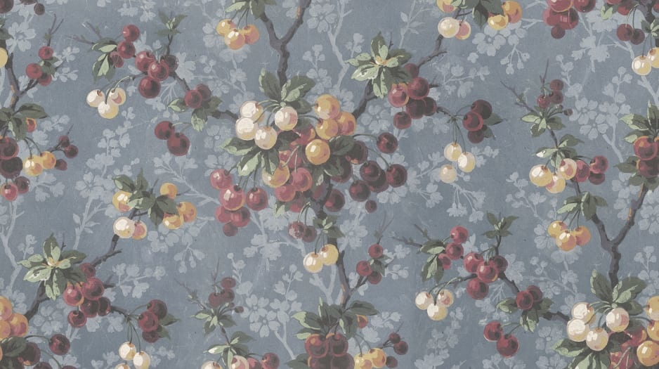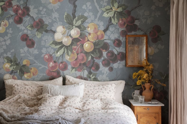 Franka is a wallpaper full of juicy grapes and intertwined branches. This wallcovering by Sandberg from the Villa Dalarö II collection shows the grape pattern against a graphic background with blossom branches. A botanical wallpaper that is perfect for a classic, timeless and atmospheric interior.