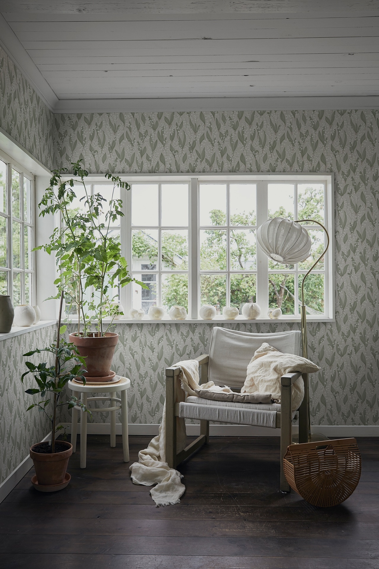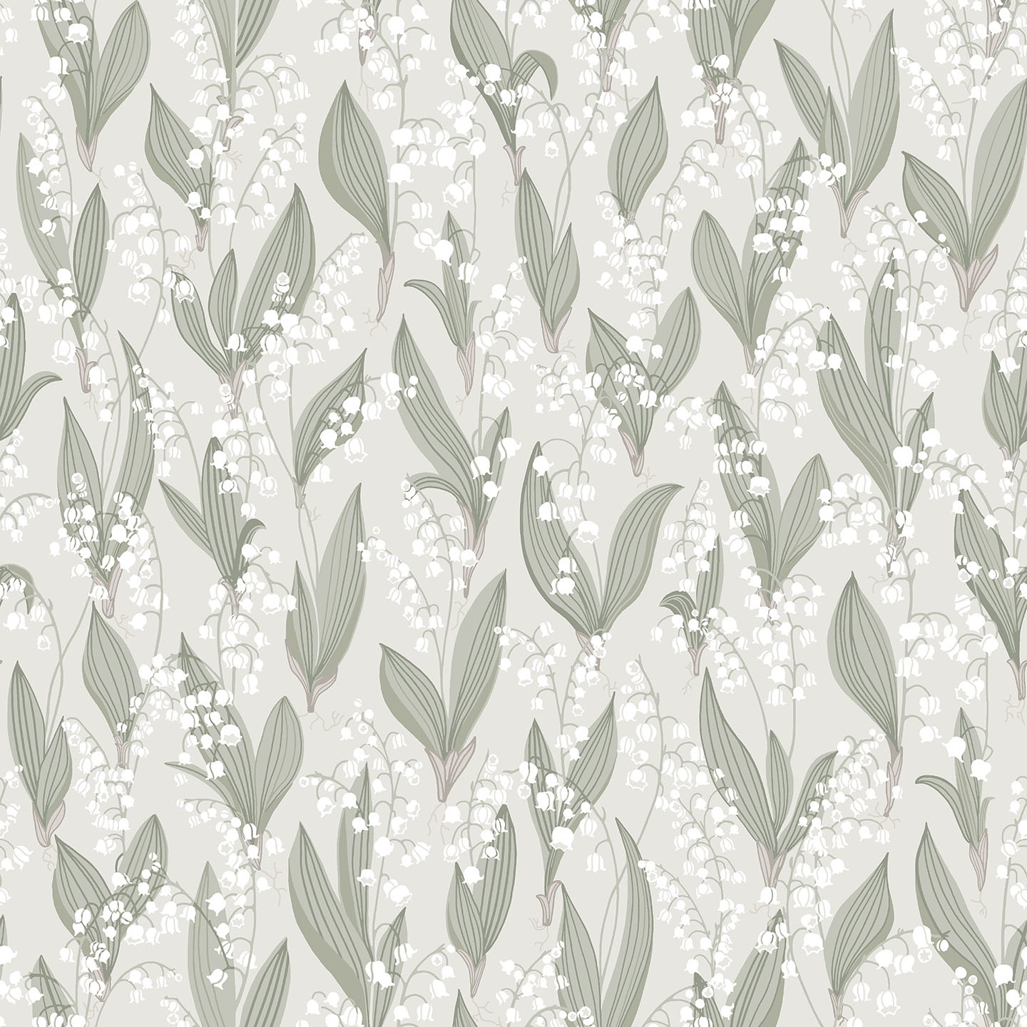 The dream of being surrounded by a fragrant forest full of white delicate flowers and green leaves, in a sea of our sweet lilies of the valley. The lily of the valley is printed with a roller and the wallpaper takes on beautiful color depth and life. Design: Karolina Kroon