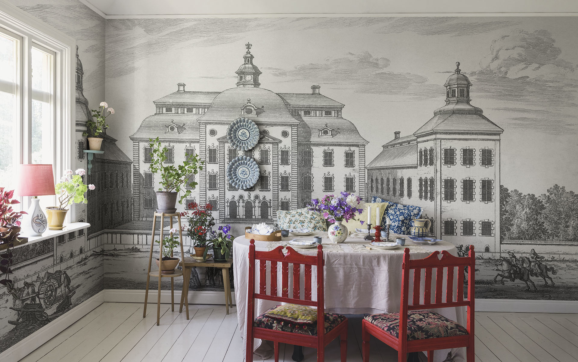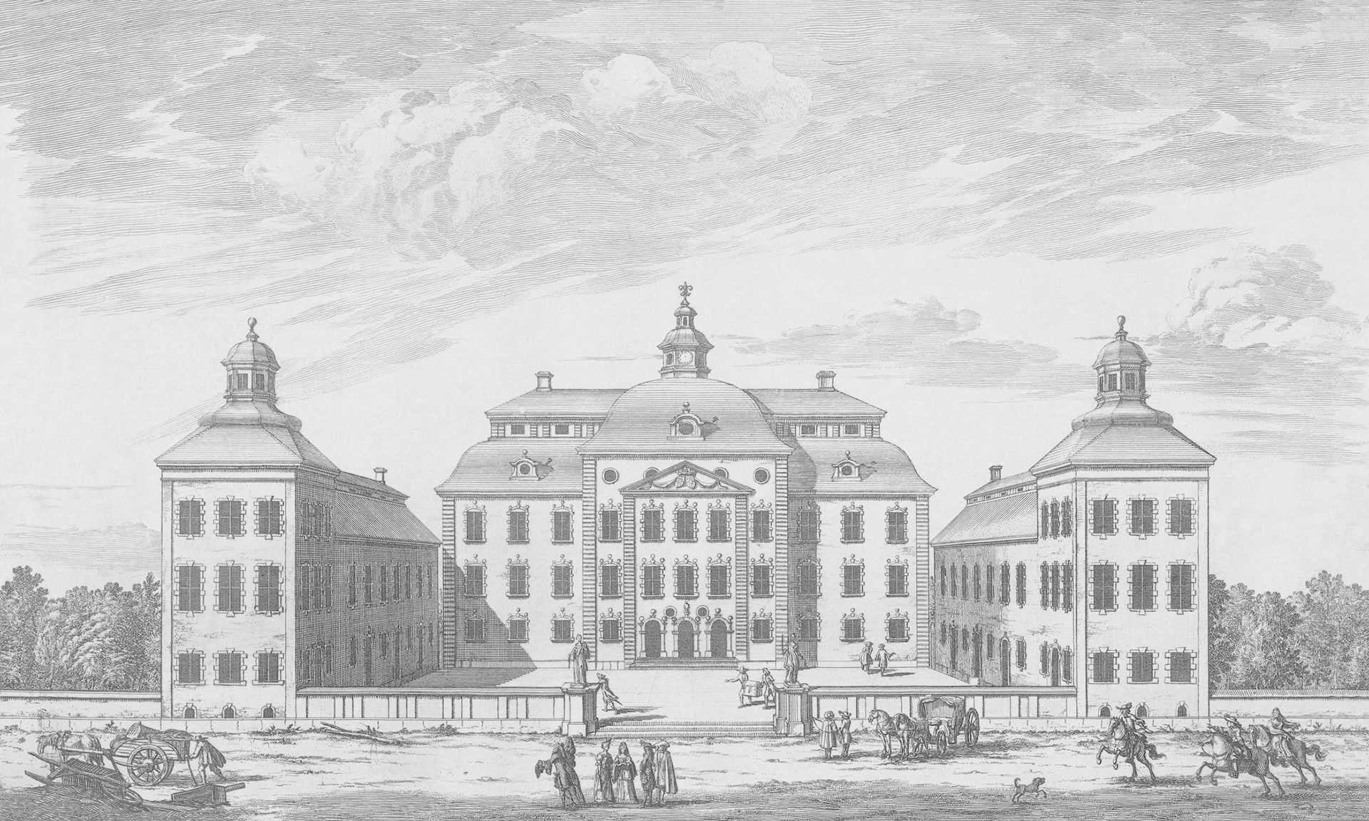 The original of this large mural is an older etching of Löfstad Castle, made in the 17th century. The etching can be found in the work of Suecia Antiqua et Hodierna by Erik Dahlberg. The first version of the castle, by the old Axel Lillie, had an external staircase, towers with stepped gables and facades painted with figures. Design: Original 17th century etching