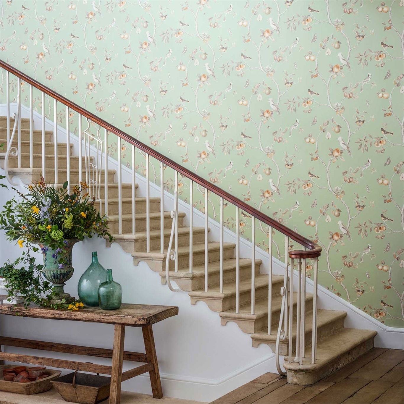 Fruit Aviary wallpaper was originally created using pencils and watercolor paints, this exotic botanical wallpaper depicts blue jays and wood warblers among branches surrounded by peaches, cherries, pears and plums. Welcome in the corridors and reception rooms.