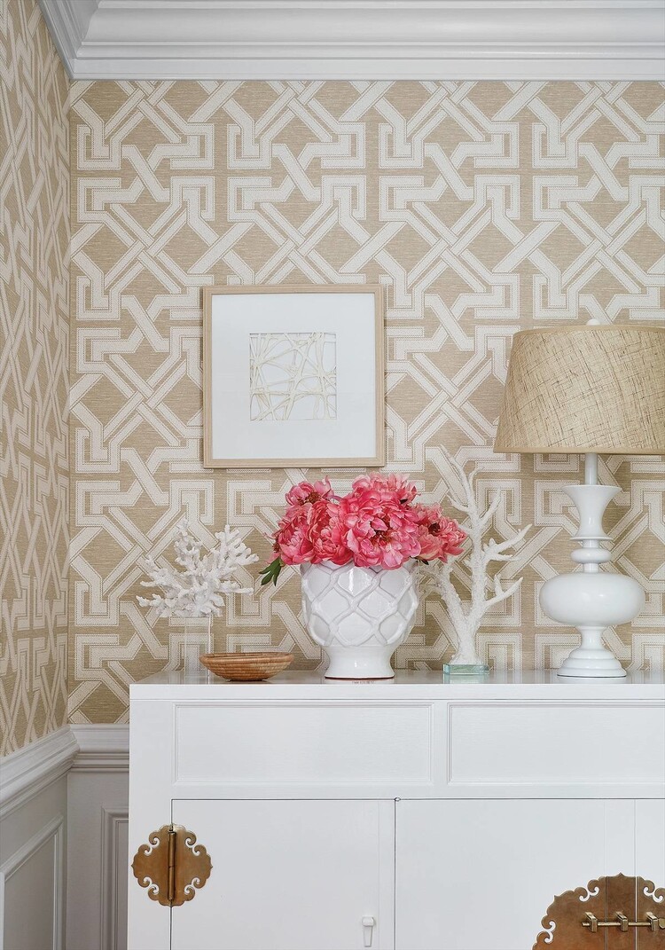 Thibaut Wallpaper Benedetto design is an interlocking chain pattern that is geometric with a nice traditional aesthetic. This design is printed on a very subtly ground textured wallpaper.