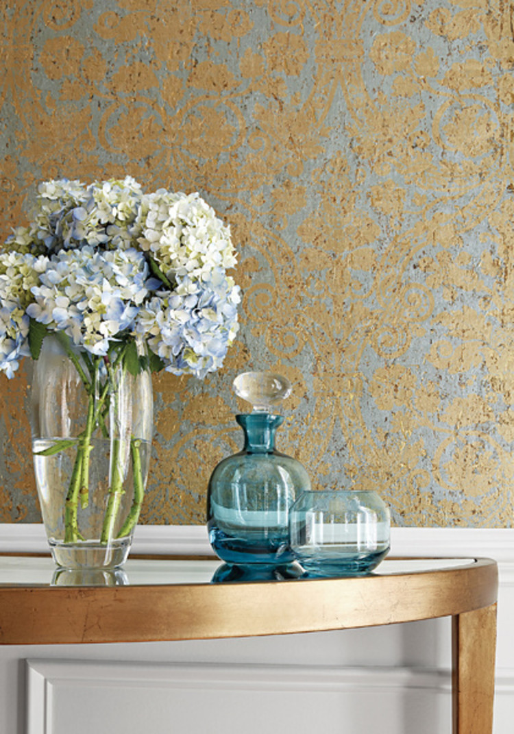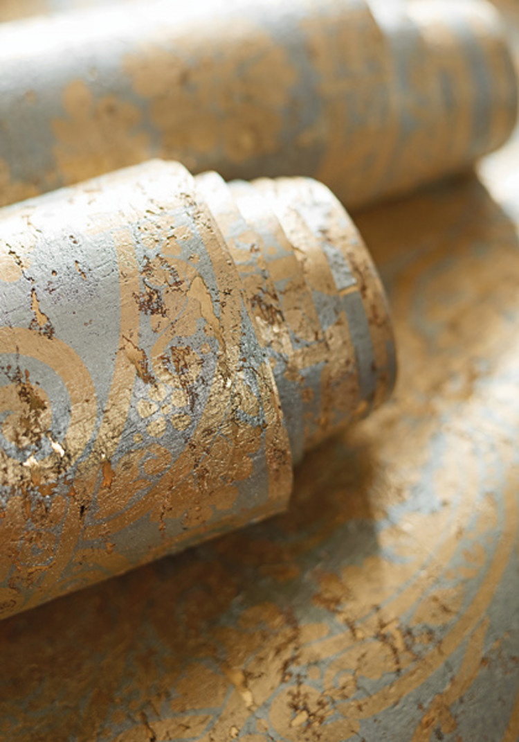 Curtis Damask, handsome and invigorating, is the perfect balance of contemporary styling and traditional design with the medieval motif printed upon a cork and foil background.
