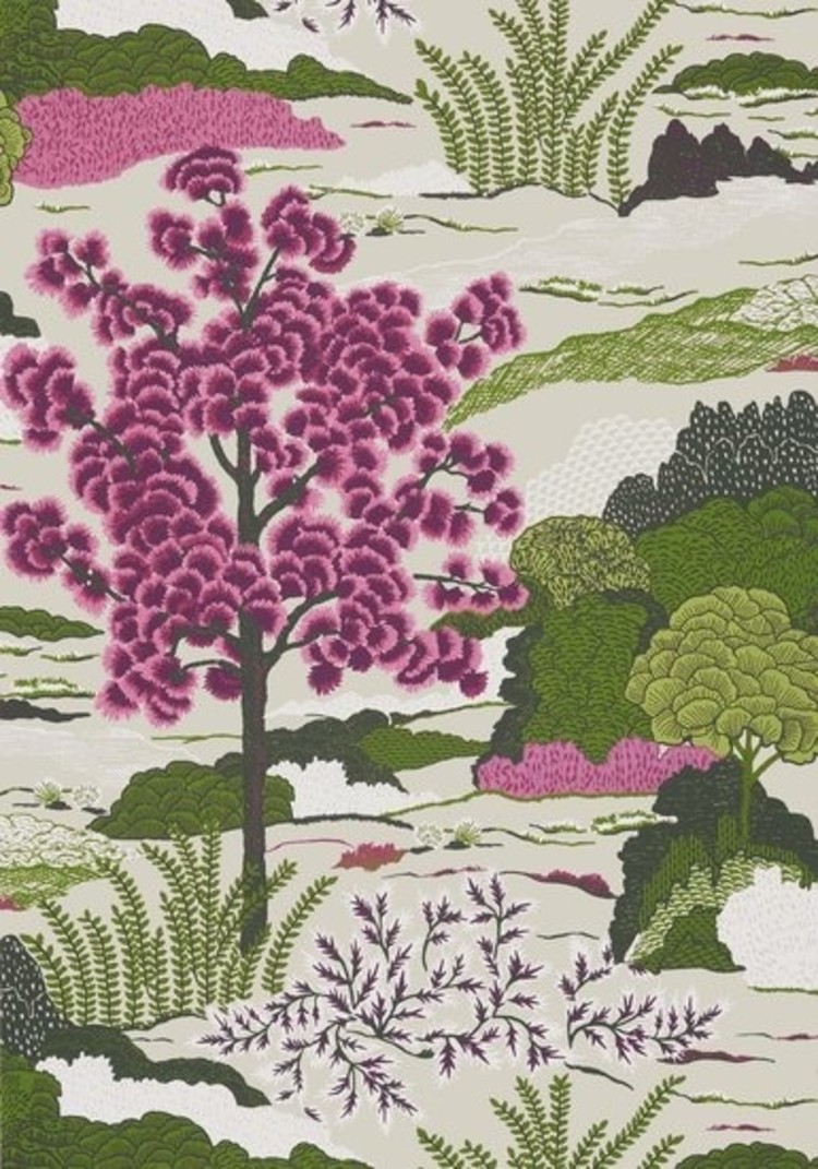 The Daintree wallpaper from Thibaut shows a toile / landscape and is enchanting and lively. A large-scale print of trees, wild foliage, hills and shrubs. A stylized interpretation of the famous Australian tropical forest of the same name and is part of the Greenwood collection of the American design house.