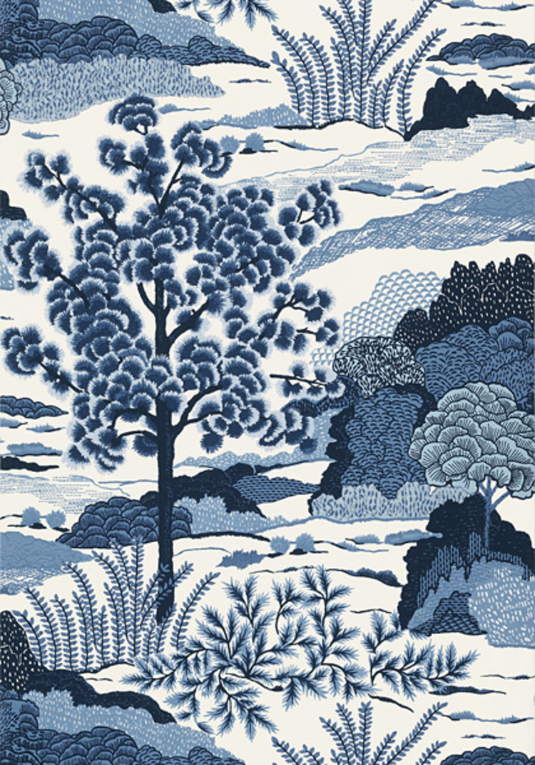 The Daintree wallpaper from Thibaut shows a toile / landscape and is enchanting and lively. A large-scale print of trees, wild foliage, hills and shrubs. A stylized interpretation of the famous Australian tropical forest of the same name, it is part of the American design house's Greenwood collection.