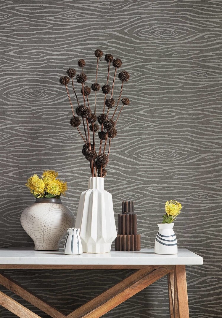 The Haywood wallpaper pattern is a faux, surface-printed wood pattern featuring a thick raised ink that adds dimension and interest. A subtle background texture simulates natural woodgrain.