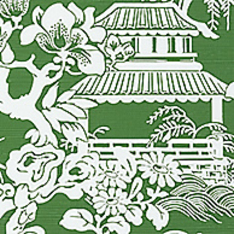 Japanese Garden wallpaper with flowers and architecture. Printed on non-woven wallpaper that looks like grass cloth
