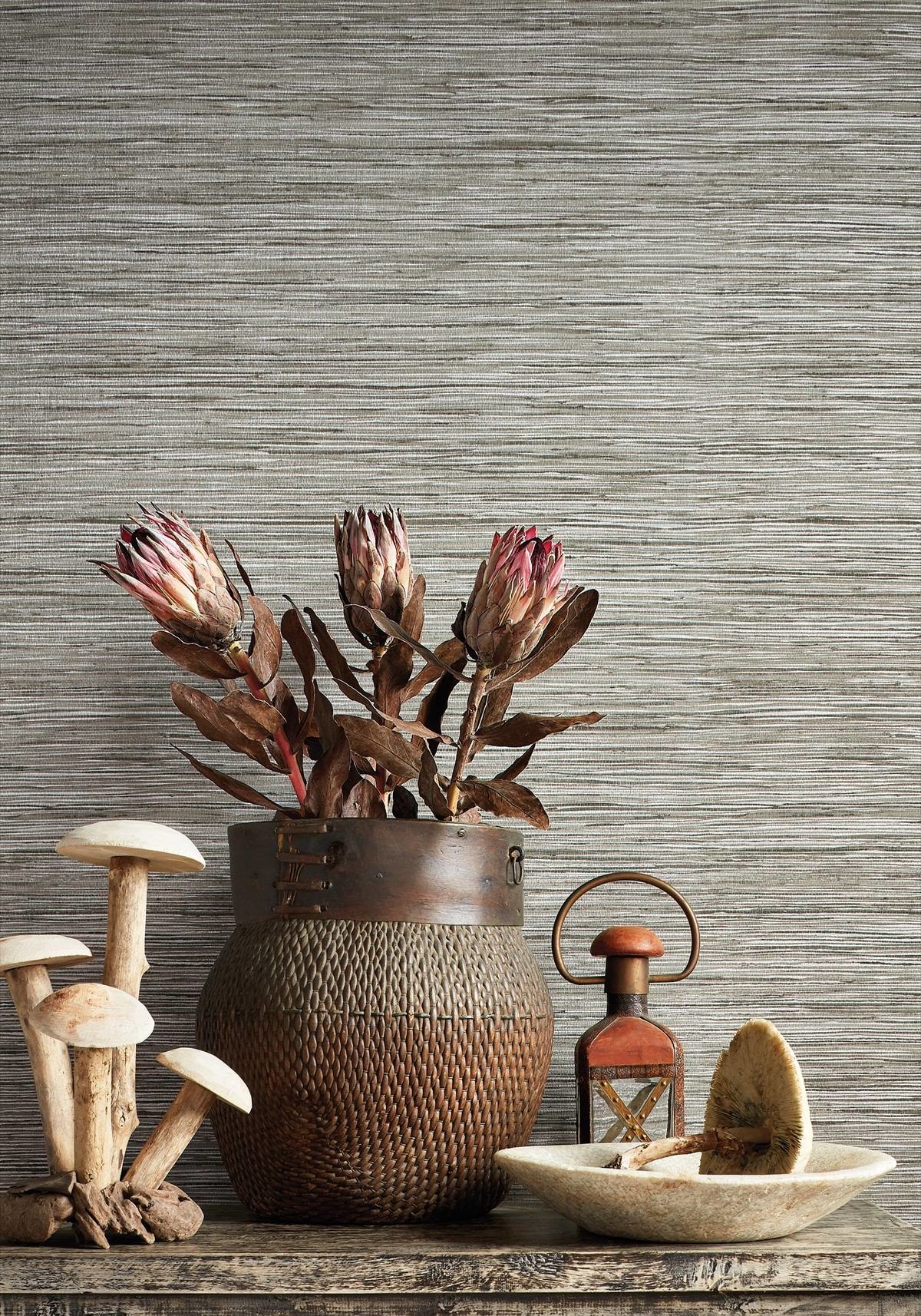 The Jindo Grass wallcovering realistically simulates grasscloth wallpaper. It is gravure printed with a mix of tones and colors on vinyl with a grasscloth emboss.