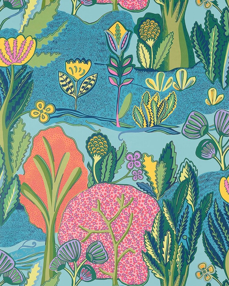 Thibaut's Wanderlust collection brings the atmosphere of distant travels indoors with exotic leaf motifs, romantic tulip gardens and tropical mangroves. Playful designs are combined with modern geometry, rich colors and soft tones such as apricot and ginger. A versatile collection that invites both adventure and relaxation.