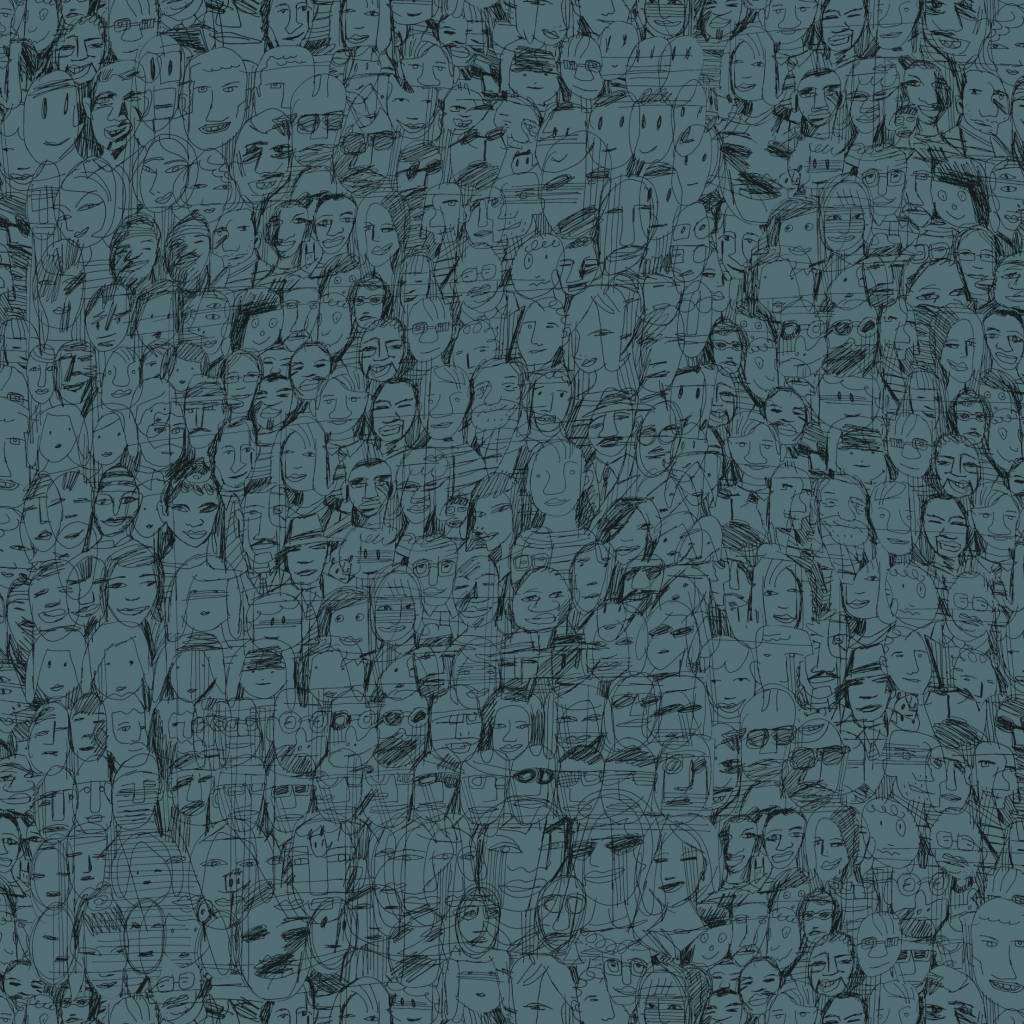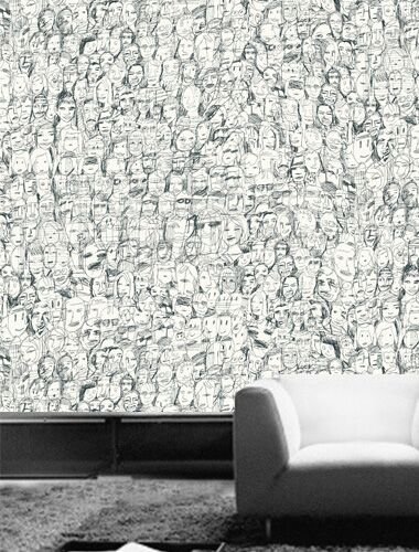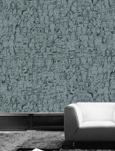 Behang uit de collectie 9 Selvas de Mariscal van Tres Tintas. Patroon Mil Caras (19954) met gezichten in kleur donker grijs. Dit behang, met rapport, is afwasbaar en kan rechtstreeks op de muur geplakt worden.