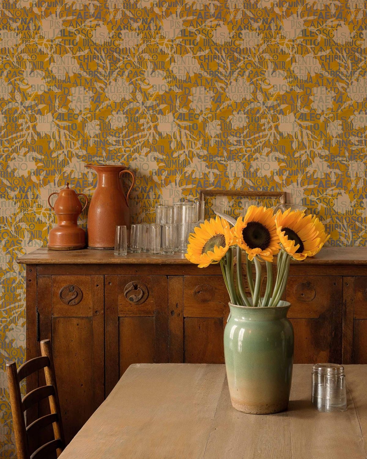 The Solera collection by Tres Tintas offers a colorful perspective on celebrations, delicious food, beautiful landscapes, and Spanish craftsmanship. It's full of joyful traditions that inspire you to enjoy life. It captures moments that matter more than time itself – it’s all about what you feel and experience. This wallpaper fits perfectly in interiors with a bohemian, Mediterranean, or vintage style, or as a striking statement wall in a modern home. It truly shines in warm, vibrant spaces such as the kitchen, dining room, or hallway.