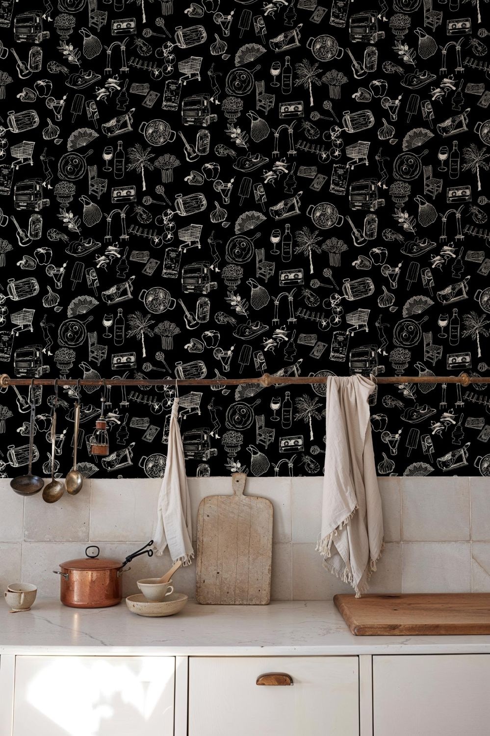 The Solera collection by Tres Tintas offers a colorful perspective on celebrations, delicious food, beautiful landscapes, and Spanish craftsmanship. It's full of joyful traditions that inspire you to enjoy life. It captures moments that matter more than time itself – it’s all about what you feel and experience. This wallpaper fits perfectly in interiors with a bohemian, Mediterranean, or vintage style, or as a striking statement wall in a modern home. It truly shines in warm, vibrant spaces such as the kitchen, dining room, or hallway.