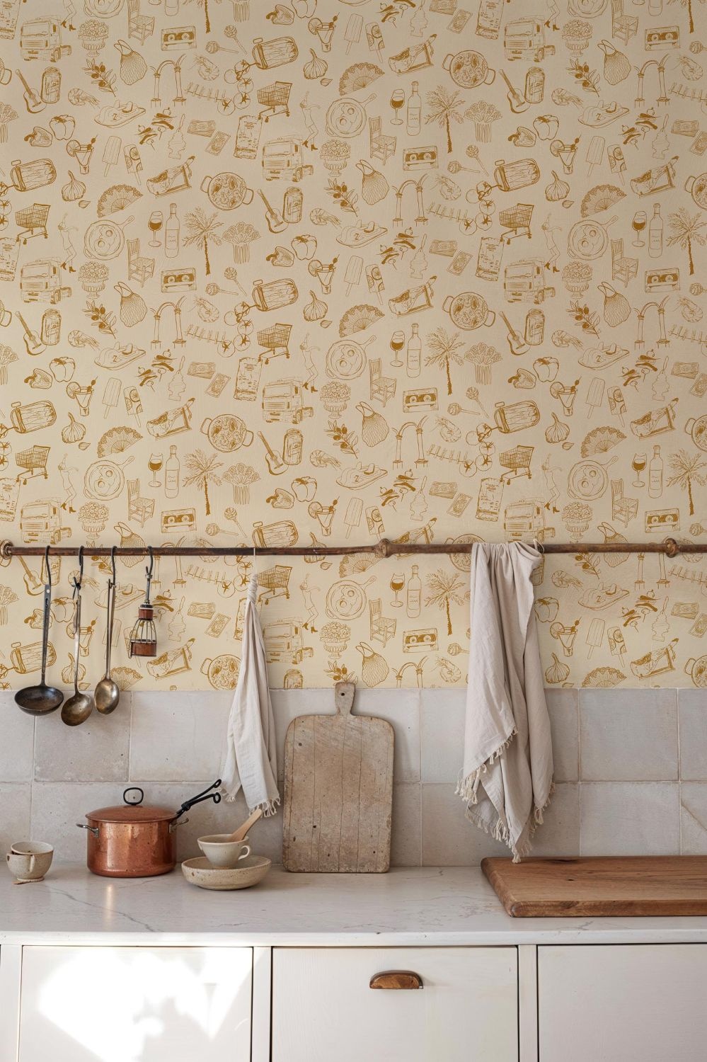 The Solera collection by Tres Tintas offers a colorful perspective on celebrations, delicious food, beautiful landscapes, and Spanish craftsmanship. It's full of joyful traditions that inspire you to enjoy life. It captures moments that matter more than time itself – it’s all about what you feel and experience. This wallpaper fits perfectly in interiors with a bohemian, Mediterranean, or vintage style, or as a striking statement wall in a modern home. It truly shines in warm, vibrant spaces such as the kitchen, dining room, or hallway.