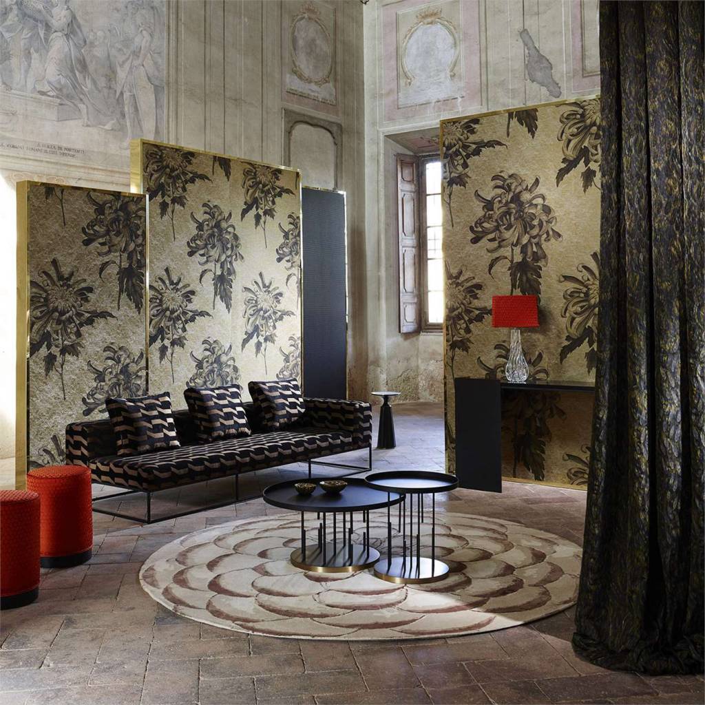 Capturing all of the intricate details of the original botanical artwork painted from still life within the Zoffany studio this elegant chrysanthemum head motif retains a feminine touch whilst adding drama through the dynamic colour combinations. A part of The Muse Evelyn is named after Evelyn Waugh whose 1930s novel ‘Vile Bodies’ depicted this colourful scene. A non-Woven backed fabric wallcovering Evelyn has been digitally printed onto the same ground as the Zoffany Akaishi wallcovering found in the Akaishi Wallcovering collection