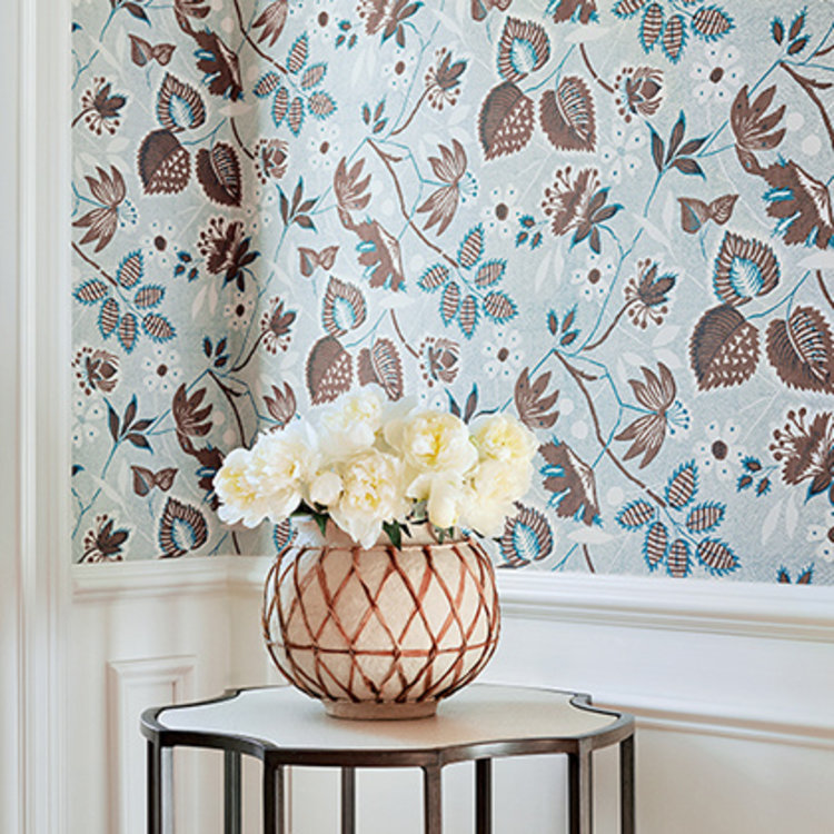Indienne behang heeft een prachtig botanisch dessin met verweven takken en bladeren. Ideaal om een vleugje natuur aan de muren van elk huis te geven.