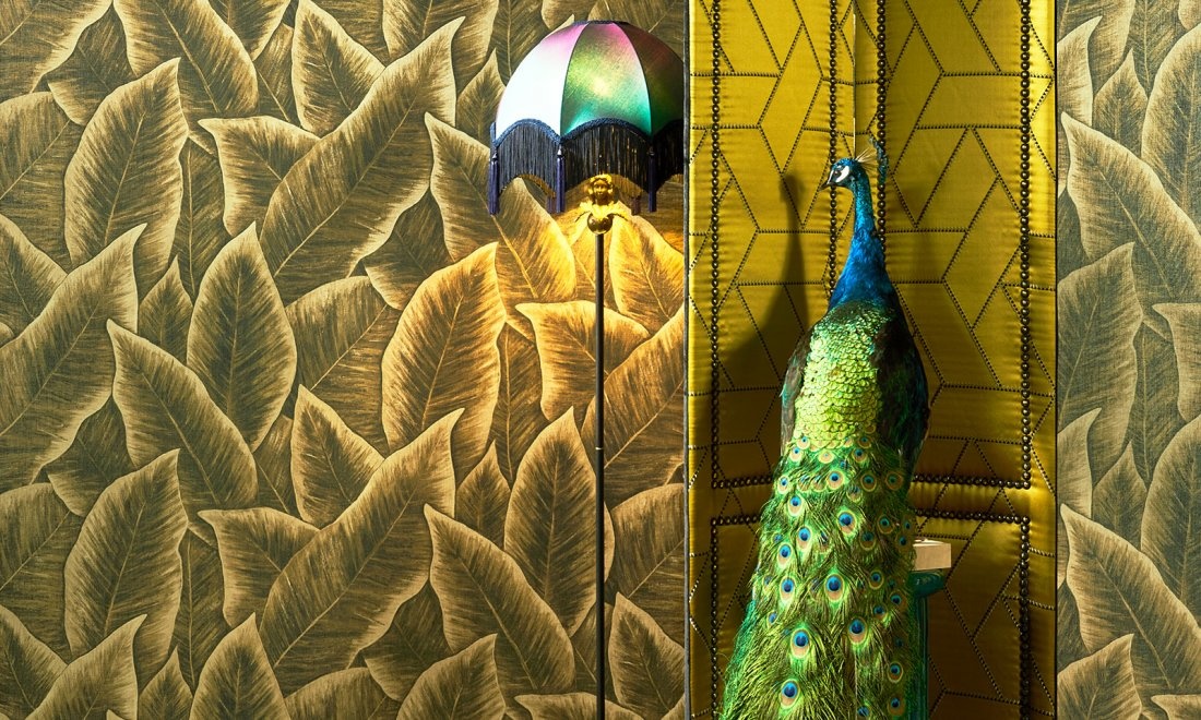 Bird of Paradise behang van Arte. Dit behang zit vol met prachtige intense bladeren van een Zuid-Afrikaanse plant. Deze handgeschilderde bladeren intrigeren door hun eenvoud en diepe kleuren. Stoffen hoes met fijn linneneffect.