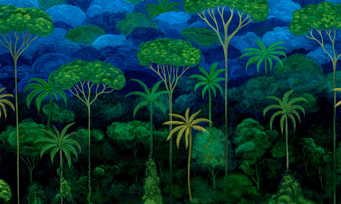 Ciel Tropical behang toont een vreemde skyline van de tropische jungle. Dit weelderige panorama is gemaakt van ultrazachte fluwelen stof en voegt een vleugje exclusiviteit toe aan uw omgeving.