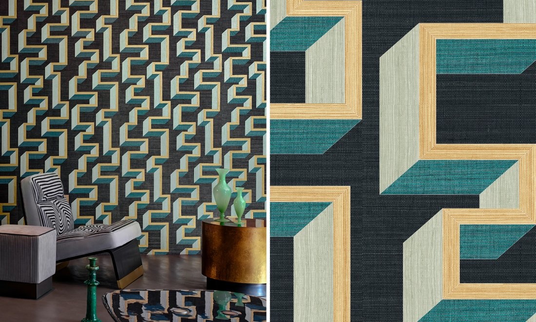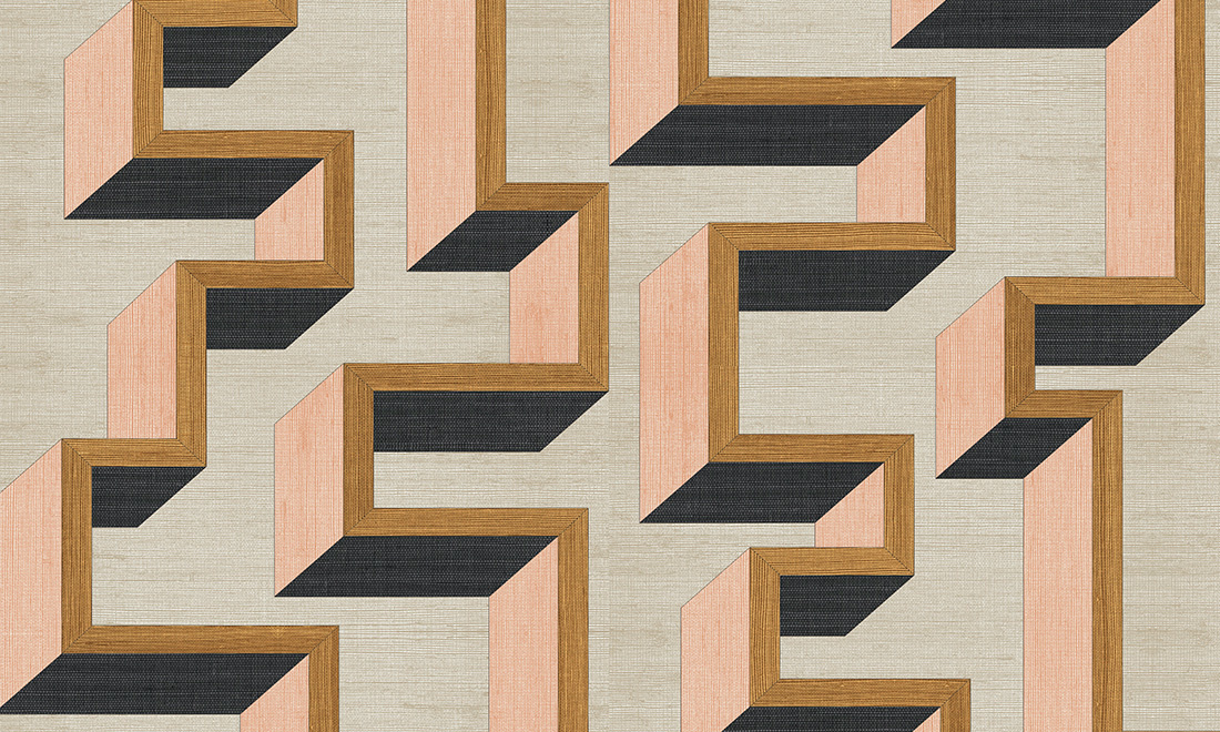 Detour behang heeft een leuk, geometrisch patroon. Het doolhofpatroon en de dubbele richting van het sisalweefsel creëren een 3D-effect. Dit effect wordt versterkt door het gebruik van drie verschillende kleuren.