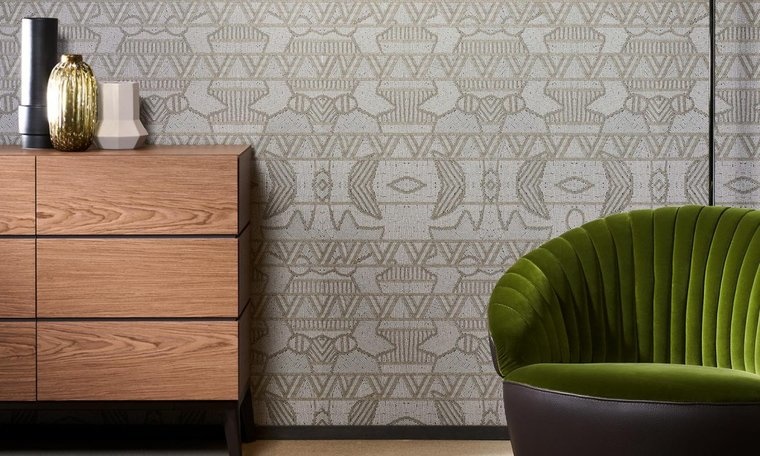 ARTE Empire Behang heeft hetzelfde ‘quillwork’ als Civilia, maar dan met een uitgesproken motief. Het is precies gemaakt zoals de Paleo Indianen het al deden, gestileerde figuren uitgekerfd in hout, steen of been. Uit opgravingen weten we ook dat ze dol waren op gekleurde materialen zoals koraal, turkoois en jade, tinten die je ook in deze collectie aantreft.