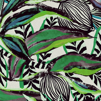 Flor Imaginaria behang. Deze kleurrijke, tropische tekening met verticale fil-à-fil techniek is geïnspireerd op de Chinese lantaarnplant (Physalis). Het patroon en het kleurgebruik zijn beïnvloed door Afrikaanse waxstoffen, in de inmiddels alom aanwezige typisch Afrikaanse prints.