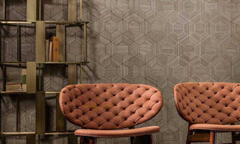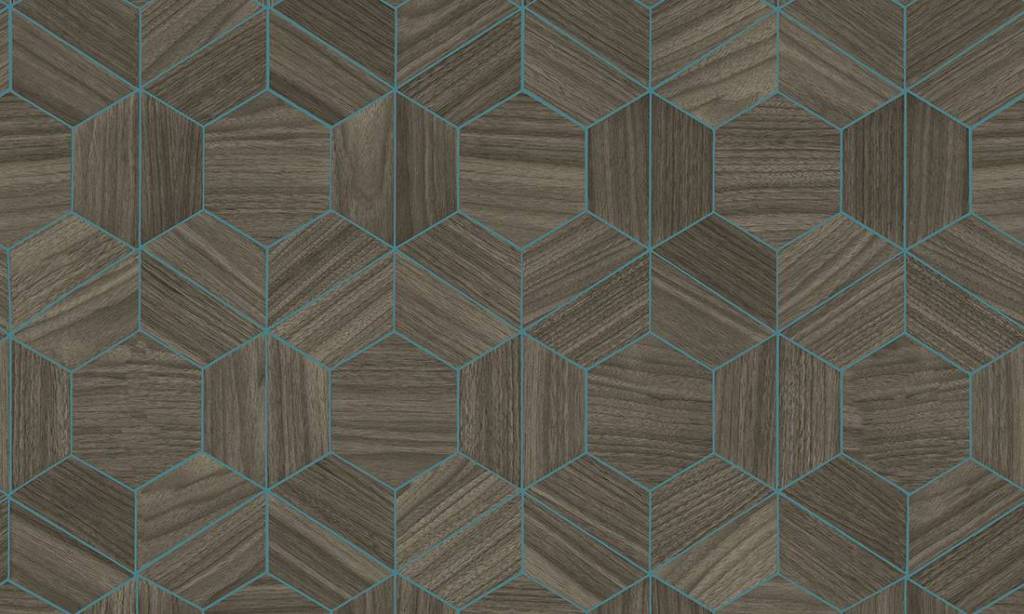 Het behang ARTE Hive heeft een geometrisch patroon van vijfhoeken met de natuurlijke uitstraling van hout fineer.