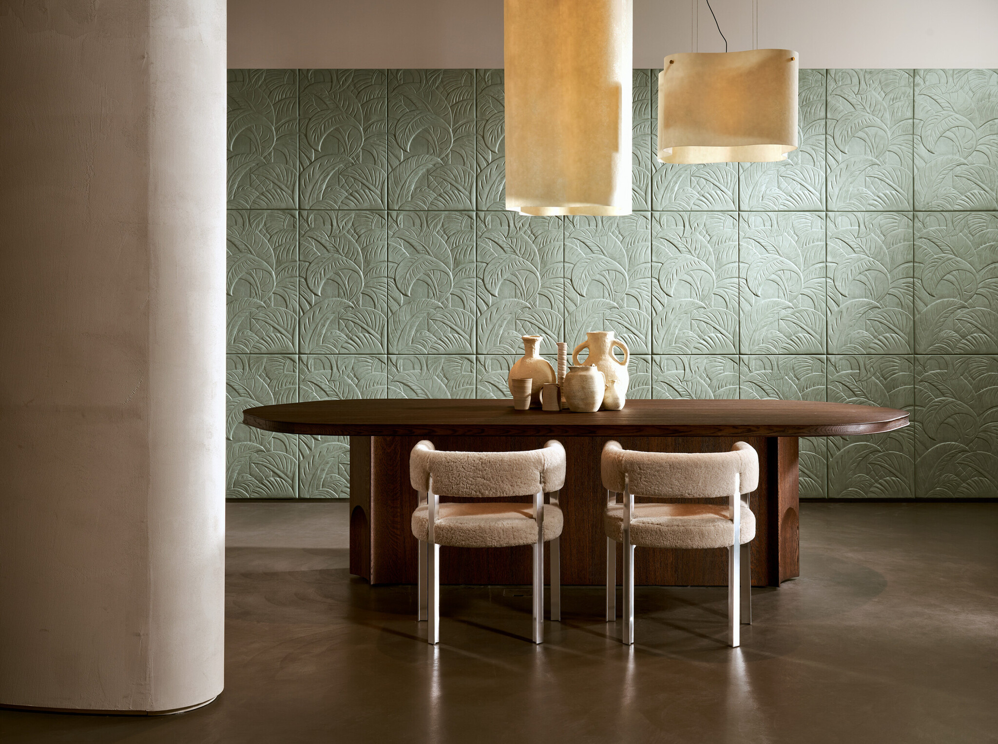 Deze tegelvormige tekening krijgt aanzienlijk reliëf dankzij de toegepaste techniek en het volumineuze materiaal. Het patroon haalt inspiratie uit dadelpalmen, een veelvoorkomende plant in het Midden-Oosten.