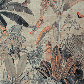 Milk and Honey behang is een dromerig gezicht dat je meeneemt naar een andere wereld. In het land van melk en honing leven kolibries, papegaaien en apen in vrede. Voor een ongeëvenaard vintage uiterlijk is dit panorama gedrukt op een achtergrond met een perkamentpapierstructuur.