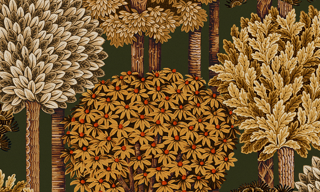 Mont Royal behang. Dit decor tovert een abstract bos aan je muur. De boomstammen vormen rechte, verticale lijnen die mooi contrasteren met de ronde vormen van de kruinen. Dit sprookjesachtige tafereel met een speelse touch is gemaakt van zacht velours.