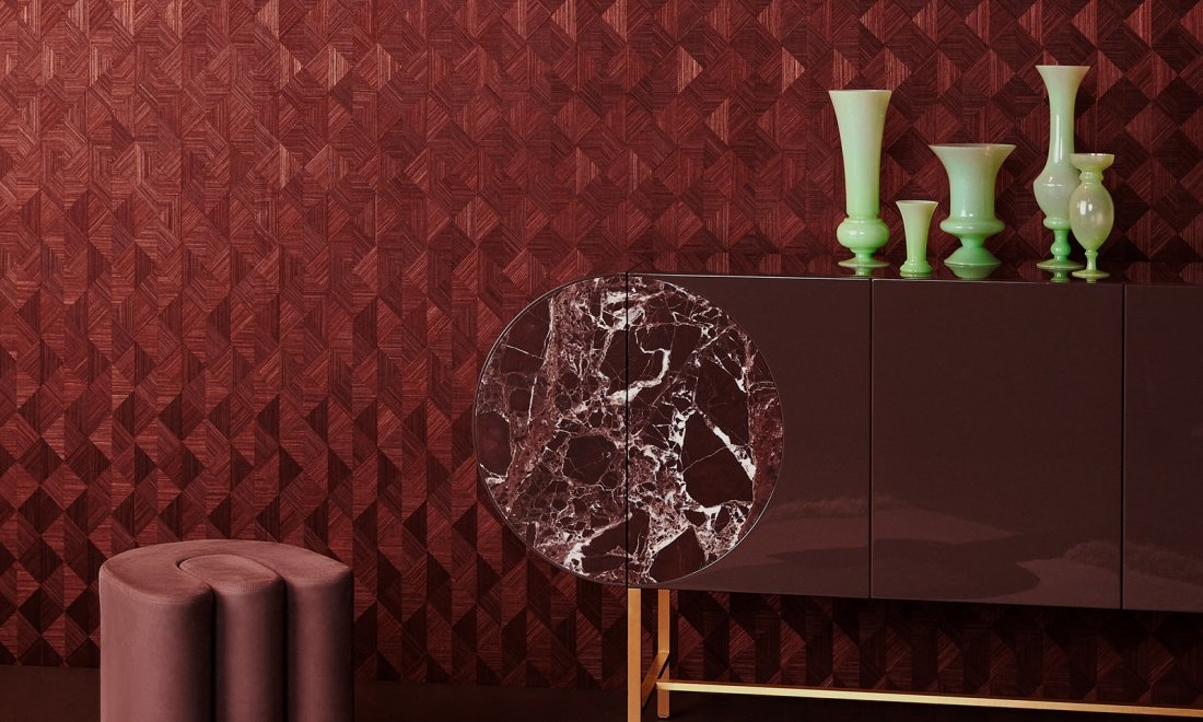 Optique behang heeft een geometrisch patroon dat speelt met optische waarneming; de ene persoon kan driehoeken zien, terwijl de ander vierkanten kan zien. De geweven sisal is horizontaal, verticaal, diagonaal oplopend en diagonaal aflopend gerangschikt. Deze vier richtingen produceren een verscheidenheid aan geometrische vormen en kleurnuances. Dit behang is brandvertragend.