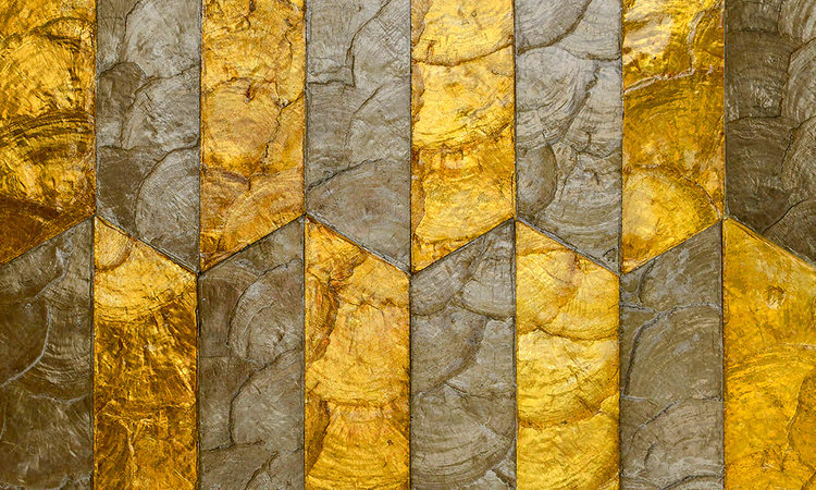 Echte schelpen in een geometrisch patroon waarin de kleurnuances van het parelmoer variëren naargelang de lichtinval.