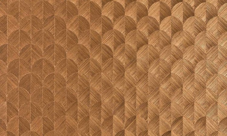 Leaf behang heeft een patroon dat lijkt op de bladeren van de ginko biloba, de Japanse walnotenboom. Bij de twee bladhelften is de oriëntatie van de stof anders gedraaid, zodat je nu eens links, dan weer rechts dikkere of dunnere draden ziet. Afhankelijk van de lichtinval veranderen ook de tinten: van groen-oker en goudkleurig naar bruin, bijvoorbeeld, van lichter naar donkerder blauw, van bruin naar zwart. Fascinerend.