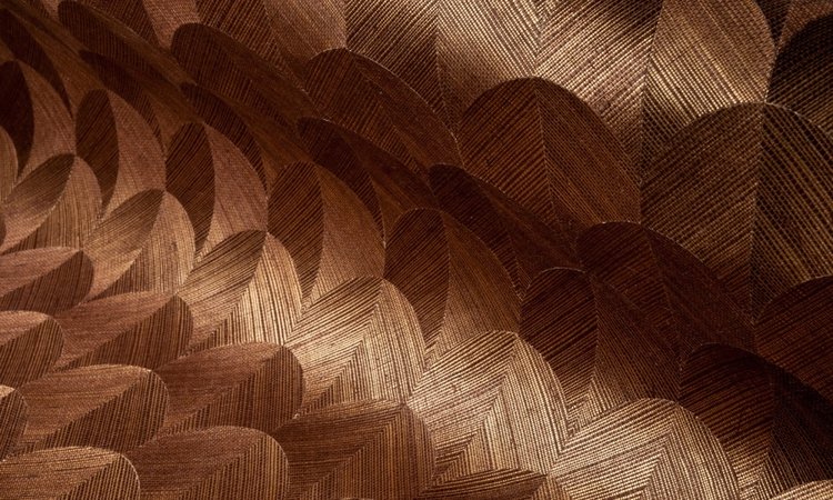 Het ARTE Leaf behang heeft een patroon dat lijkt op de bladeren van de ginko biloba, de Japanse walnotenboom. Bij de twee bladhelften is de oriëntatie van de stof anders gedraaid, zodat je nu eens links, dan weer rechts dikkere of dunnere draden ziet. Afhankelijk van de lichtinval veranderen ook de tinten: van groen-oker en goudkleurig naar bruin, bijvoorbeeld, van lichter naar donkerder blauw, van bruin naar zwart. Fascinerend.