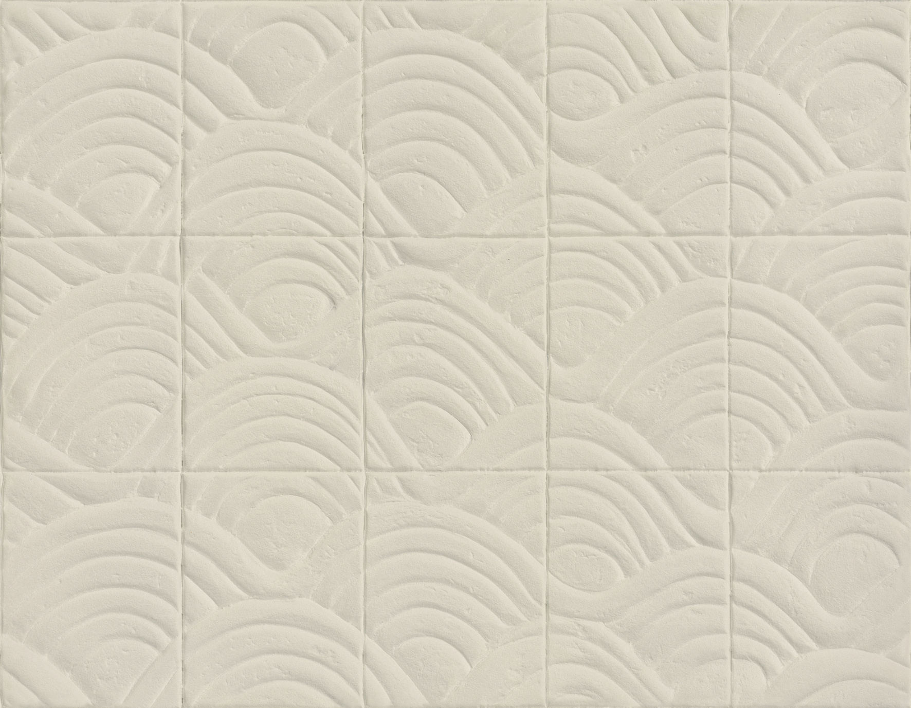 Het combineren van diverse lichte panelen in tegelvorm resulteert in een tekening die zowel geometrisch als aards oogt. Dit ontwerp roept associaties op met decoratief aardewerk of golven in het zand, dankzij het uitgesproken reliëf van de gravures.