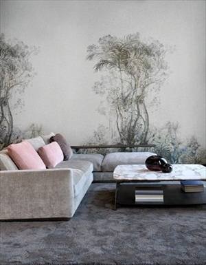 Tropic behang is verkrijgbaar in extra grote afmetingen voor een nog gedurfder panoramisch effect. Verkrijgbaar in zilver en goud.