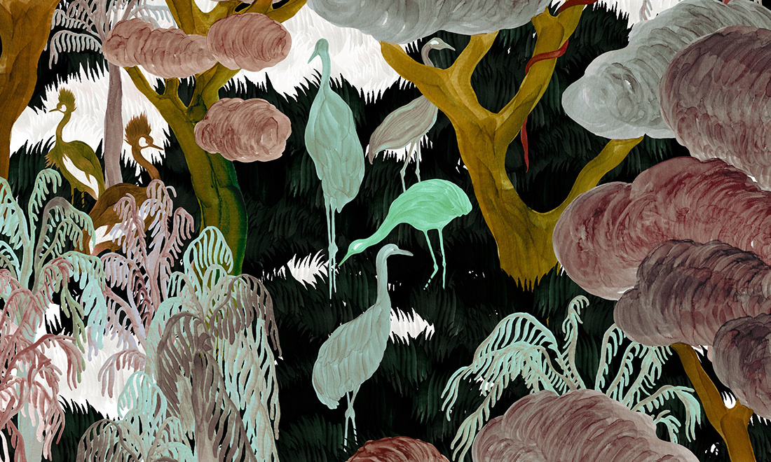 Wonderwoods behang van Arte. Deze muurbekleding heeft een design dat doet denken aan de jacht. Dit panorama behang heeft een patroon vol typische jachtdieren, zoals honden en herten. Een prachtig behang dat perfect is voor een tijdloos, chic en natuurlijk interieur.