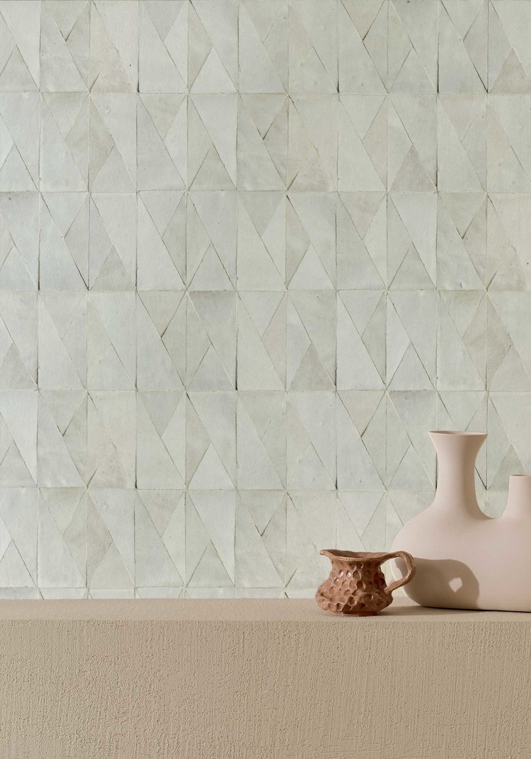 Lemta behang van Samiz Collection is samengesteld uit lijnen en kleuren en ontmoet de vibratie van een zellige tegel.