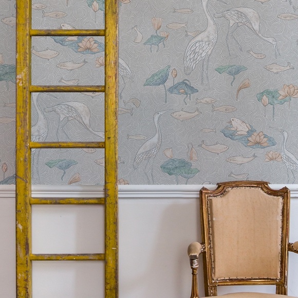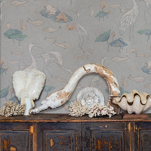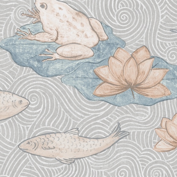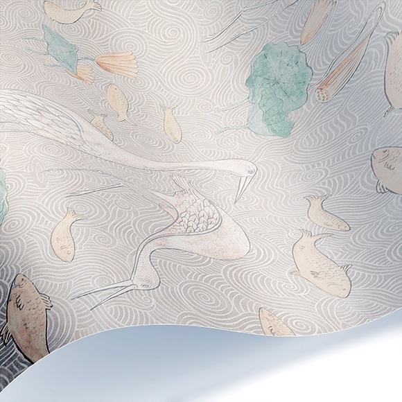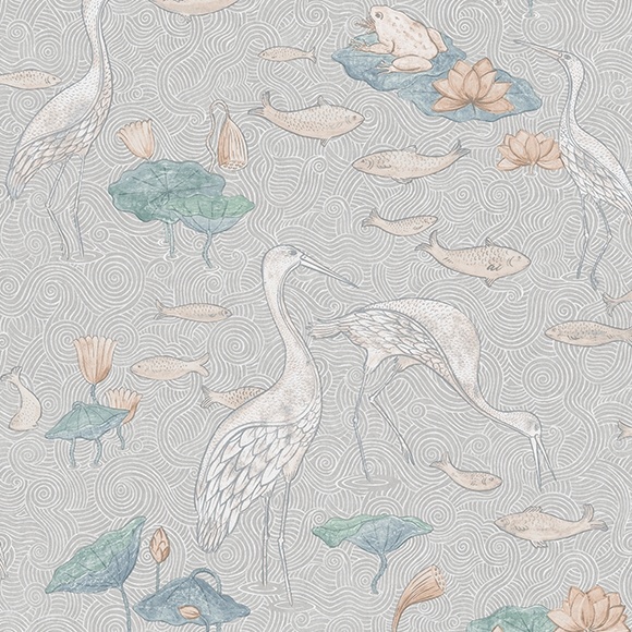 Vliesbehang met witte en lichtroze reigers omringd door beige vissen, oranje kikkers en lichtgroene waterlelies in een gestileerde zwart-witte vijver. Beschikbaar in 5 kleuren.
