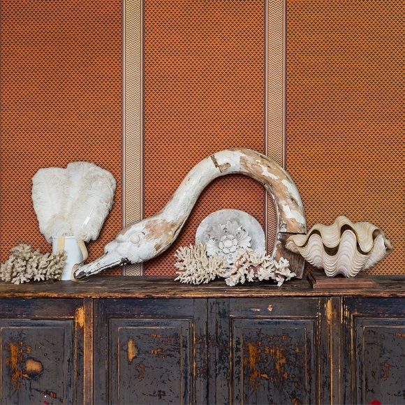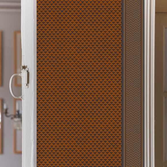 Puck Stripe is een geweldig behang dat strepen en geometrie combineert. Het patroon, bestaande uit kleine driehoeken, wordt onderbroken door een streep bewerkt met metalen zigzaglijnen, die aan etnische patronen herinneren. Shauna Dennison werd hier geïnspireerd door "Midsummer Night's Dream" van William Shakespeare, en in het bijzonder door de tuniek van Oberon, de koning der feeën. In zijn oranje en zwarte kleur heeft dit behang veel persoonlijkheid. Puck Stripe is beschikbaar in 5 andere kleuren.