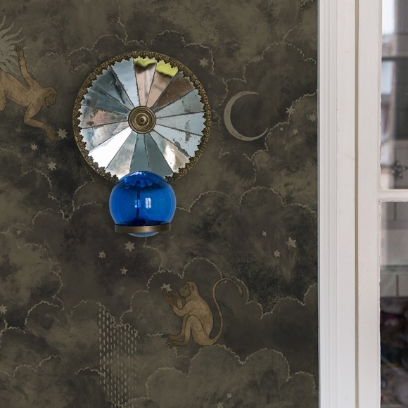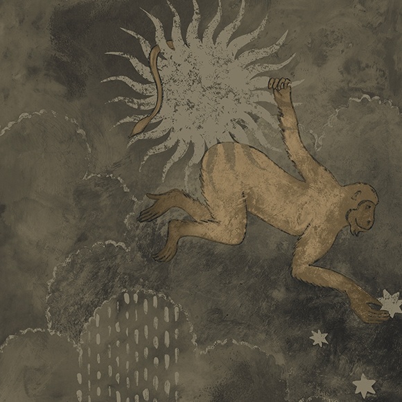 Zwart en brons vliesbehang dat een hemel met getextureerde wolken vertegenwoordigt waarin apen spelen met de zon en gouden sterren. Verkrijgbaar in 4 kleuren en ook als wanddecor met grotere patronen onder de naam Grand Stars en Monkeys.