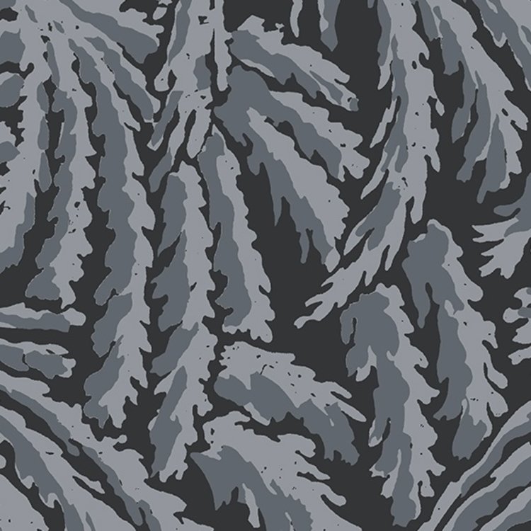 Vliesbehang met takken van lichtgrijze en donkergrijze wilg in een Art Deco-stijl op een zwarte achtergrond.