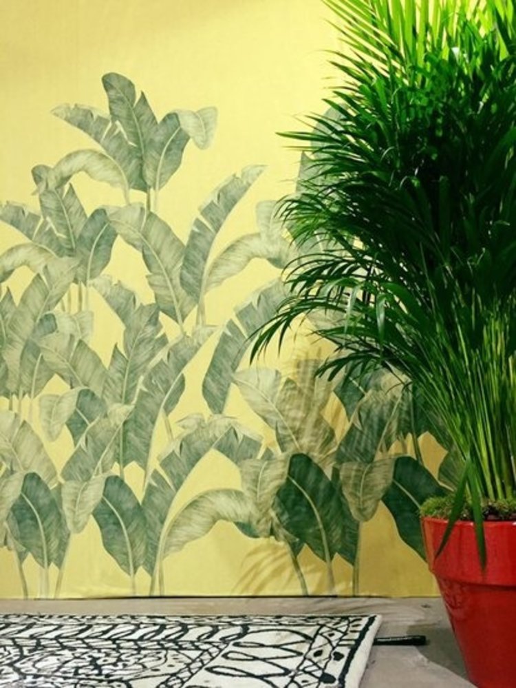 Met het Bananella behang Tres Tintas haalt u de natuur in huis. Maak van uw woonkamer of slaapkamer een oase van rust. En creëer een oase van rust en met deze botanische tekening van bananenblad. Vergelijkbaar met het Beverly Hills Hotel behang (Martinique behang), maar dan de vernieuwde versie, bij wijze van spreken. Met palmenblad / bananen blad dat tegen de muren op groeit. Het ontwerp van dit paneel behang is van de hand van de Spaanse designer Sophia Pegas.
