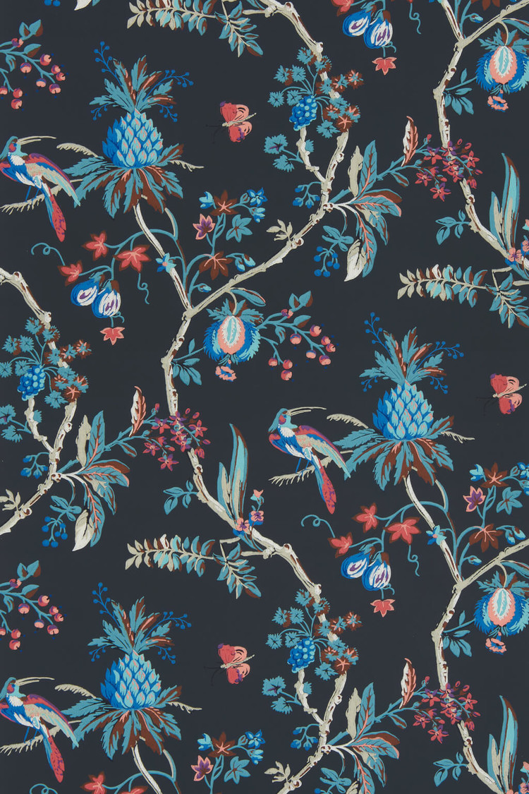 La Comedie wallcovering is originally a stitched printed wallpaper from the 18th century. The print was also reused as a stage costume. The costume is currently kept in the archives of Pierre Frey. This wallcovering uses the traditional cylinder printing technique.