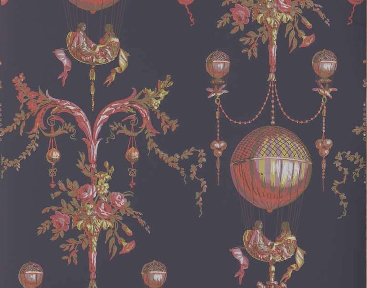 Dit heteluchtballonmotief is kenmerkend voor de 'ballonmanie' die na de eerste vluchten van de Montgolfier-broers in 1783 door de decoratieve kunsten vloog. Het arabesk-paneel is een reproductie van de ballon die vanuit de Jardin des Tuileries in Parijs werd gevlogen op de eerste van December van dat jaar, met twee figuren die spandoeken zwaaien. Het origineel was met houtblok gedrukt op samengevoegd papier, waarschijnlijk door de fabriek in Reveillon, waarvan de tuinen werden gebruikt als opstijgplaats op testvluchten door Etienne Montgolfier en Pilatre de Rozier. Het is gedrukt op een effen achtergrond of op Gisors-strepen.